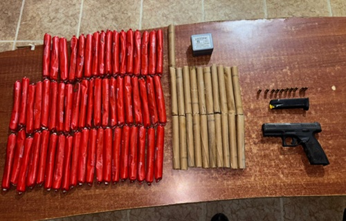 De acuerdo con el reporte oficial, durante la intervención se decomisaron 55 cargas explosivas, 21 tacos de dinamita, una pistola calibre 9 milímetros, una caja sellada de detonadores para mecha de seguridad, 10 municiones calibre 9 milímetros y un alimentador metálico para pistola.