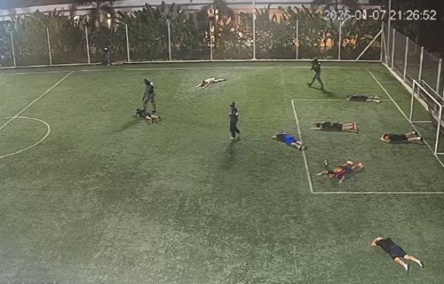 El reloj marcaba las 21:26 cuando el partido de fútbol compartido por un grupo de personas es interrumpido por la incursión de los sujetos armados. En una toma inicial se observa que los jugadores se sorprenden y se lanzan al piso.