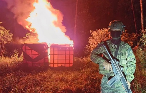 Durante la operación, el personal militar identificó aproximadamente 1.250 galones de combustible tipo diésel, que se encontraban ocultos en una zona de difícil acceso. Debido a las condiciones del terreno, el material fue debidamente fijado en el lugar y posteriormente destruido, conforme a los protocolos establecidos.