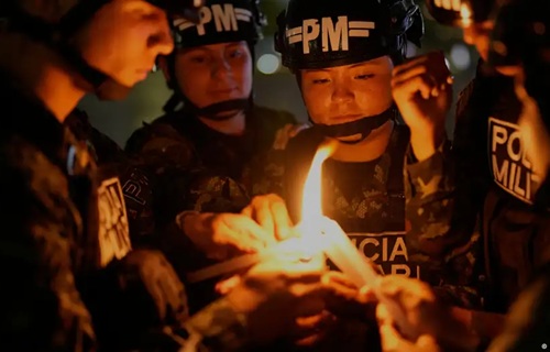 Durante el homenaje, unidades de la Policía Militar permanecieron formadas y sostuvieron velas encendidas, mientras que una guardia de honor, con uniformes de gala y fusiles, custodió la ceremonia bajo la lluvia.